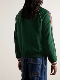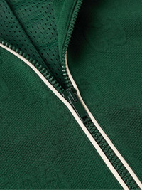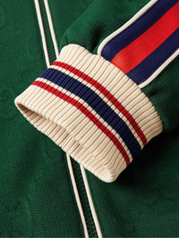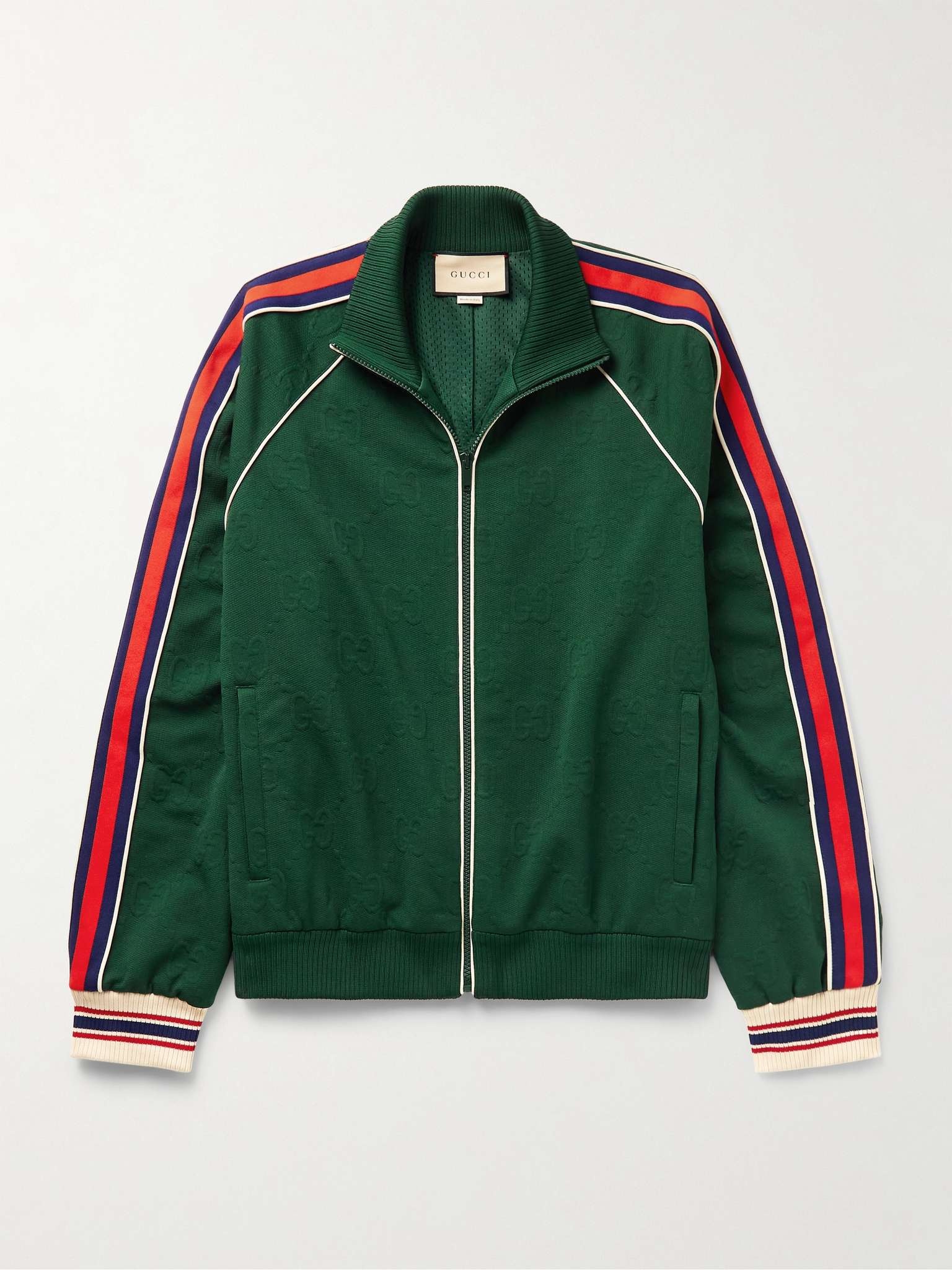Gucci’s piped track jacket incorporates the house’s signature codes in a retro-inspired way. Trimmed with striped webbing down the sleeves, it's made from tech-jersey that's subtly jacquard-knitted with the 'GG' diamond motif and fully lined in breathable mesh. Wear yours with the matching shorts. Size & Fit - Fits true to size. Take your normal size - Designed for a relaxed fit - Mid-weight, slightly stretchy fabric - Model is shown wearing a M - Model measures: chest 38"/ 96cm, height 6'2"/ 188cm Details & Care - Dark-green tech-jersey, navy, red and white webbing and ribbed-knit - 100% polyester; trim1: 100% polyamide; trim2: 93% polyester, 5% polyamide, 2% elastane - Hand wash - Designer colour: Bottle/ Mix
