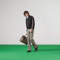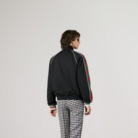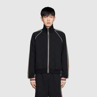 Mixing solid black with green and red, the distinctive colors of the House, this jersey zip-up sweatshirt is imbued with a vintage, sportswear inspired feel and is defined by an easy silhouette. A sporty play on an emblematic logo, the GG jacquard enriches the style. - Black GG jacquard jersey - Red and green Web details - Ivory piping - Net lining - High neck - Side welt pockets - Striped cuffs - Back length: 25"; based on size M - Zipper closure - Regular fit - Made in Italy - The model is 6'1" tall. The product shown in this image is a size small