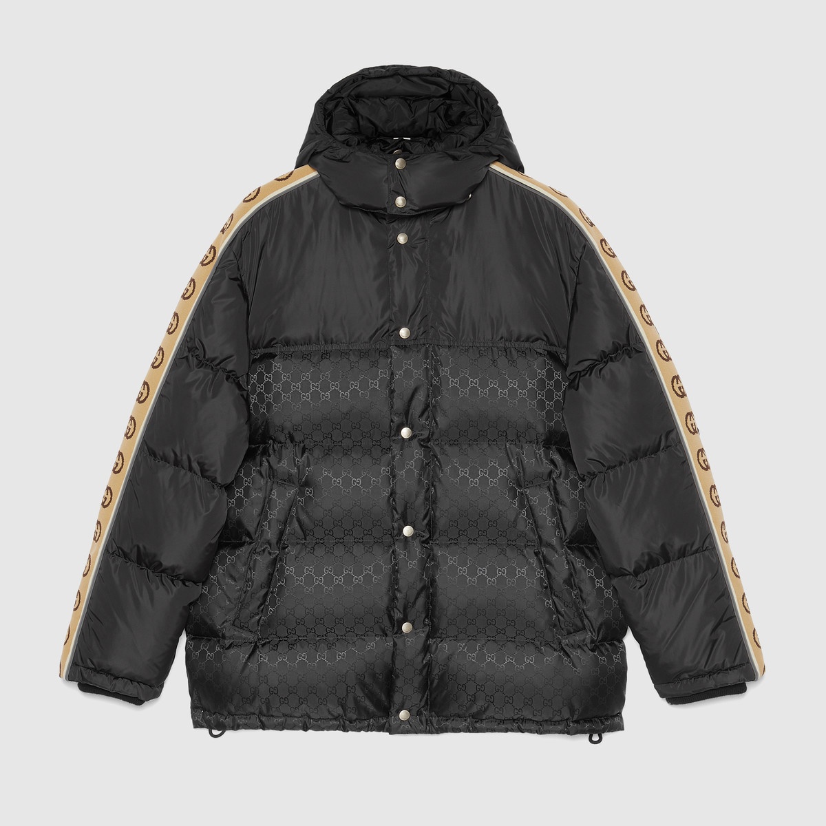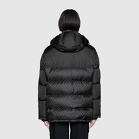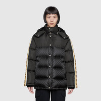 A distinctive detail of the Cruise 2020 collection, the Interlocking G stripe runs down the sleeves of this goose down padded coat, crafted from GG jacquard nylon. Reminiscent of logo tapes typically found on vintage tracksuits, the side band serves as a sporty play on the historical Gucci logo. - Black recycled nylon with GG jacquard recycled nylon - Camel and brown Interlocking G jacquard stripe down the sleeves - Down goose feather padding - Black knit rib trim - Nylon lining - Removable hood with snap buttons - Snap button and zip closure - Adjustable drawstring on the waist - Front zip pockets - Interior zip pocket - Made in Italy - The model is 6' and is wearing size 48 (IT)