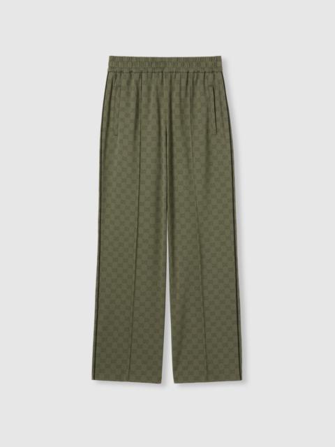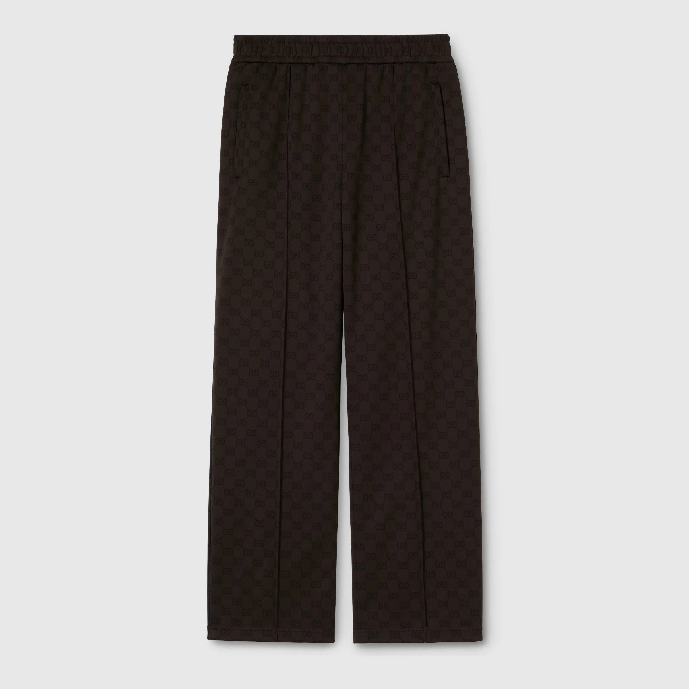 The distinctive GG is translated across different textile techniques in the collection, offering visual richness. Crafted from dark brown GG jersey jacquard, this pair of pants is completed by a piping trim. - Dark brown GG jersey jacquard - Piping trim - Elastic waist with drawstring - Two side pockets - Wide leg - Length: 43.3"; Waist: 16.3"; Hips: 23.6"; Hem width: 9.8"; based on a size M - Made in Italy