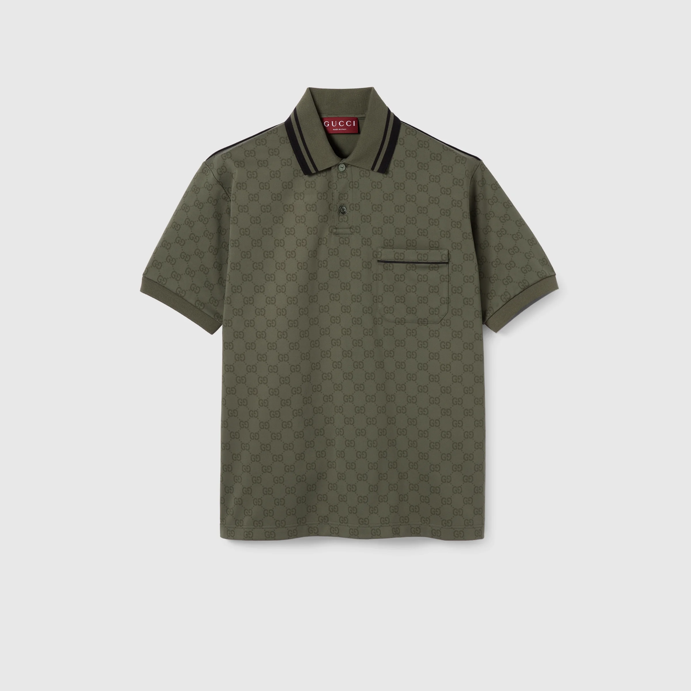 Pre-Fall 2025 pieces in muted black, grey and green tones spotlight delicate floral embroideries, embossed logos, and more craftsmanship details. Crafted from forest green GG jersey jacquard, this regular fit polo shirt is enriched with a piping trim and a contrast striped collar. - Forest green GG jersey jacquard - Piping trim - Striped polo collar - Short sleeves - Chest pocket - Rib trim - Button closure - Regular fit - Length: 28.5"; Shoulder: 19.1"; Chest: 21.7"; Sleeves length: 9.6"; based on a size M - Made in Italy