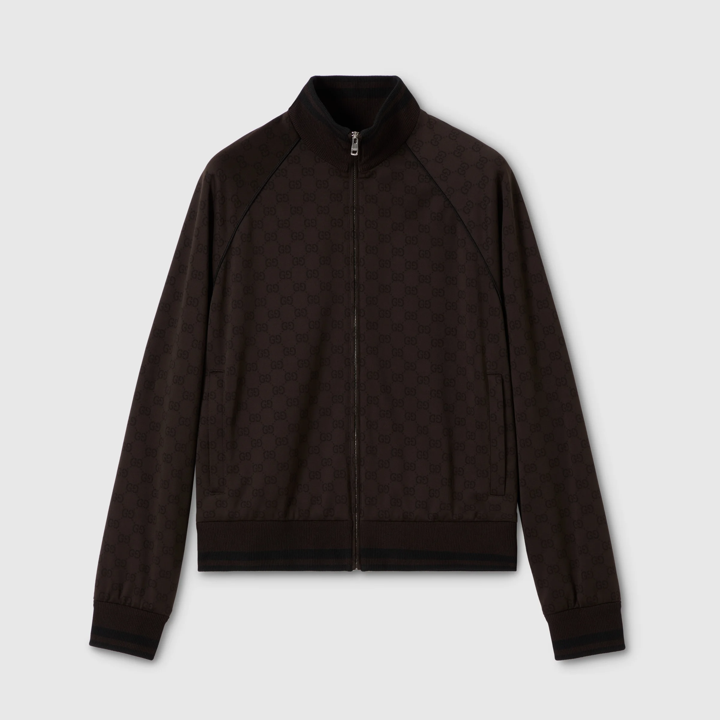 The distinctive GG is translated across different textile techniques in the collection, offering visual richness. Crafted from dark brown GG jersey jacquard, this slim fit zip jacket is completed by a piping trim. - Dark brown GG jersey jacquard - Piping trim - Funnel neck - Long raglan sleeves - Two front pockets - Rib trim - Zip closure - Slim fit - Length: 26.2"; Chest: 20.7"; Sleeves length: 32.4"; based on a size M - Made in Italy