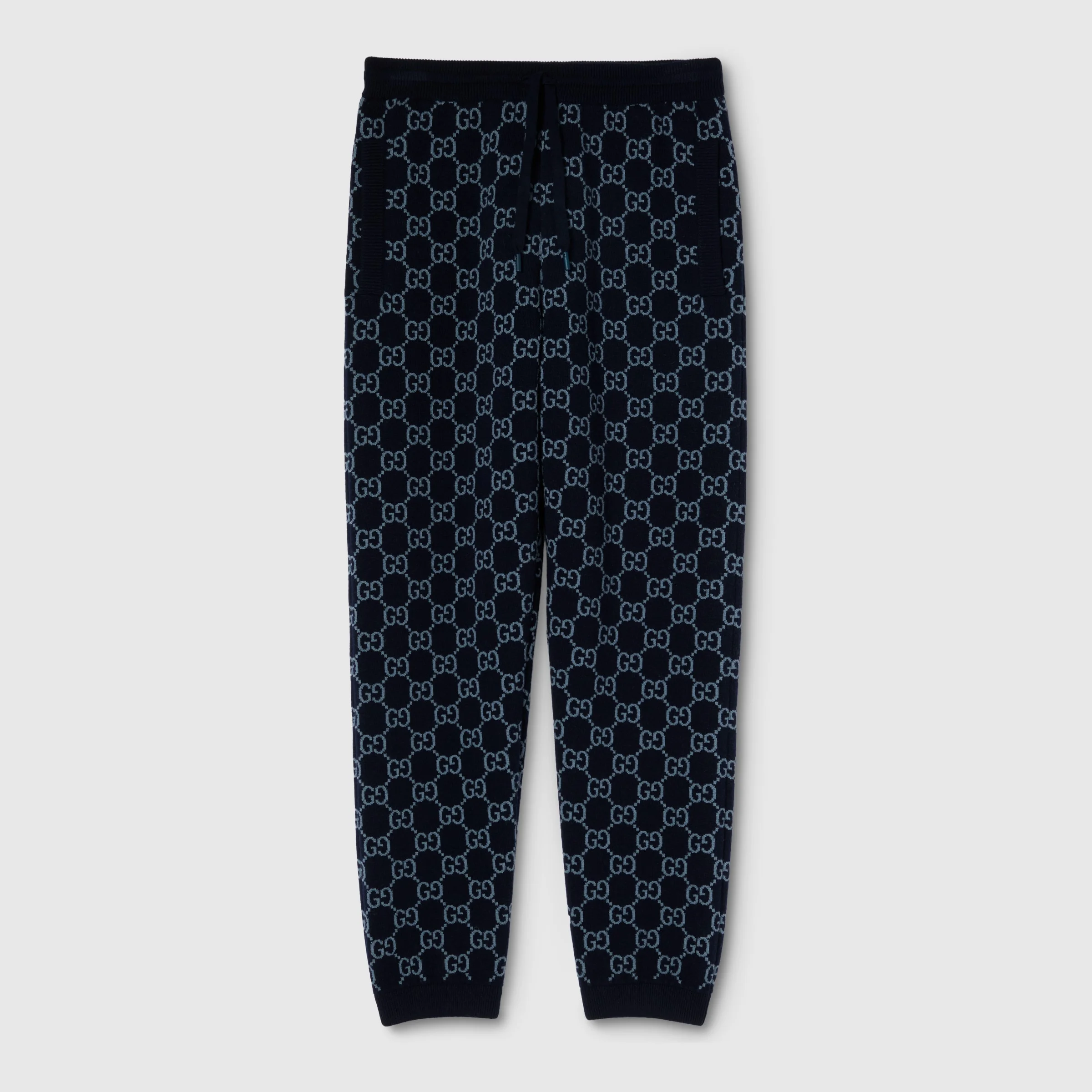 The distinctive GG is translated across different textile techniques in the collection, offering visual richness. This pair of leisure pants is made from GG knit double wool. - Dark blue ad grey GG knit double wool - Elastic waistband with drawstring - Side pockets - Length: 40.9"; based on a size S