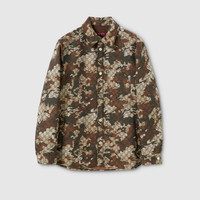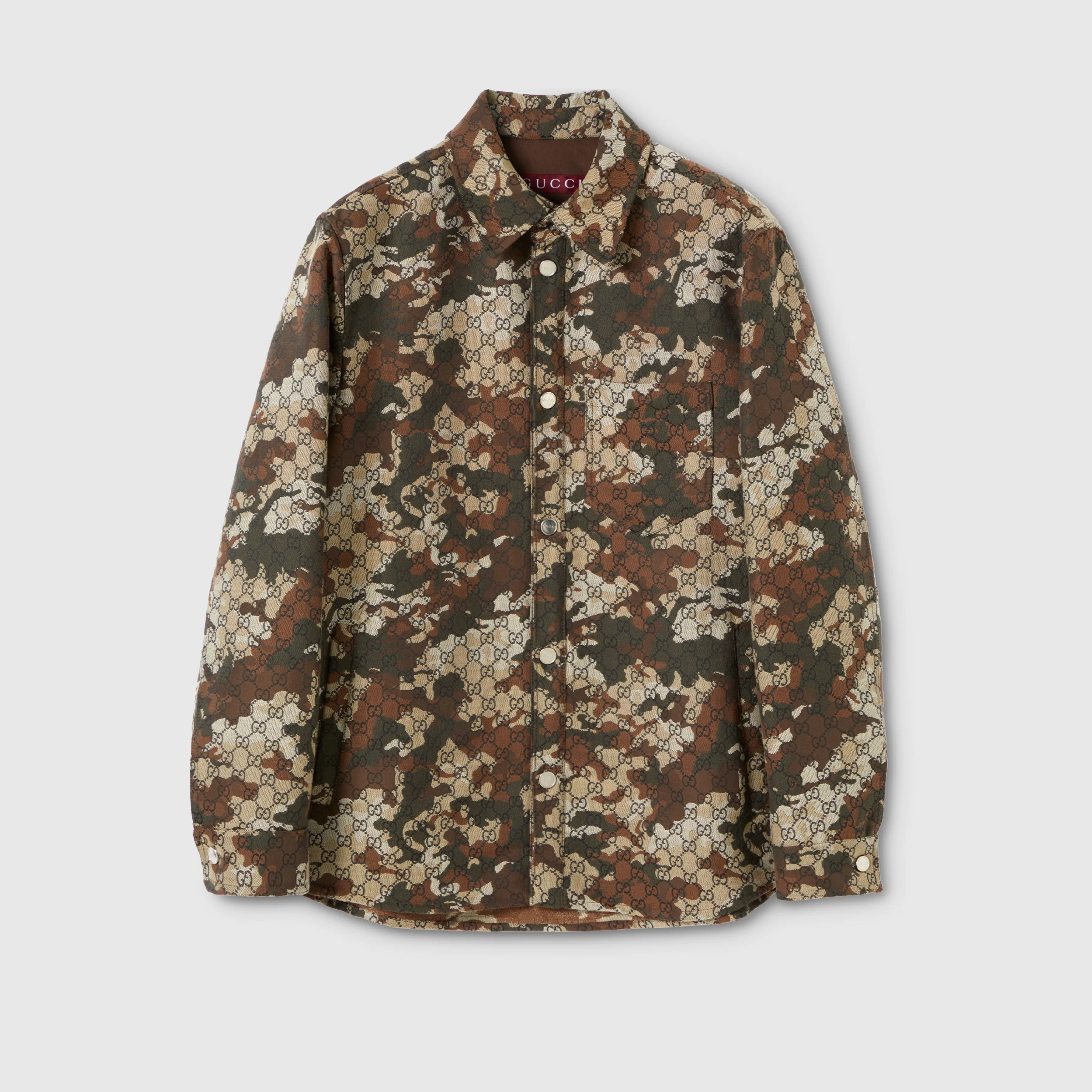 The concept of matching sets is reinterpreted through the lens of modern tailoring. Sartorial lines refine uniform-inspired silhouettes, creating complete looks. Crafted from GG marbled cotton denim jacquard, this shirt is completed with a chest pocket and a rounded hem. - Multicolor GG marbled cotton denim jacquard - Gucci metal buttons - Point collar - Chest pocket - Rounded hem - Long sleeves - Front button closure - Length: 32.2"; Sleeve length: 37.4", based on a size 48 (IT) - Fabric: 43% Cotton, 43% Polyamide, 14% Polyester - Lining: 100% Cotton