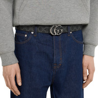 GG Marmont belts with a reversible buckle feature the House's signature motif on one side and leather on the other in neutral shades. This reversible belt is presented in leather and GG Monogram coated fabric and completed with the signature Double G buckle. - Black leather on one side, black GG Monogram coated fabric on the other - Palladium-toned hardware - Reversible Double G buckle - Width: 1.5" - Made in Italy - Can be worn as a hip or waist belt. Sizing will differ based on where the belt is worn, please refer to the size guide to find your size.
