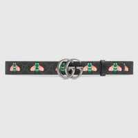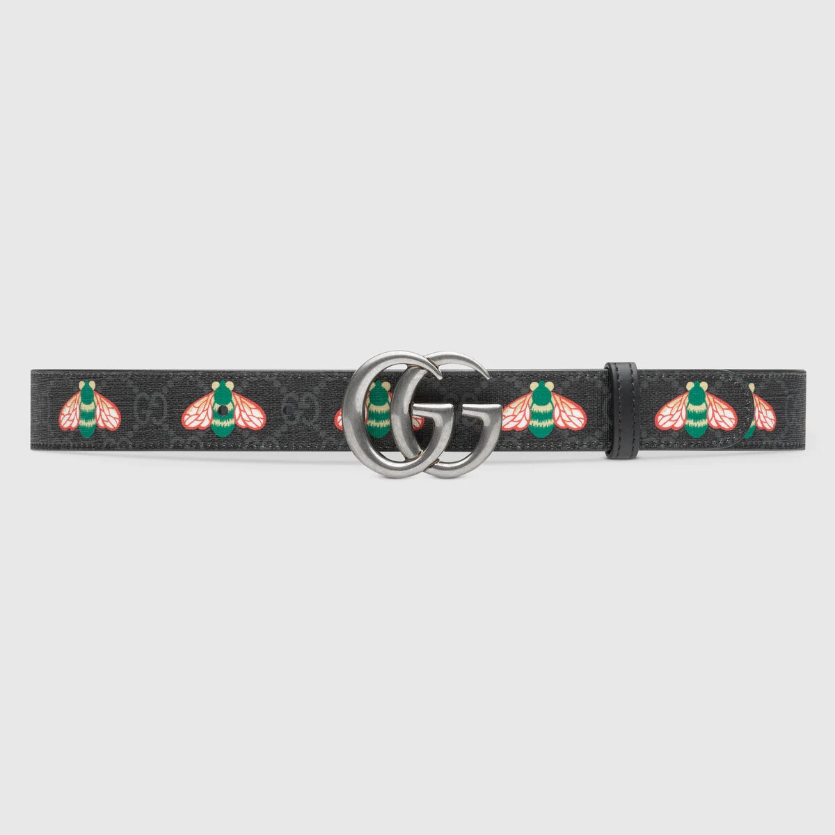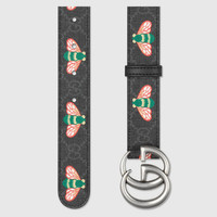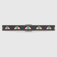 A defining creature in Gucci's menagerie, the bee is reimagined as a cartoon-inspired design. Here, the archival symbol mixes with Guccio Gucci's monogram atop this thin belt. - Black and grey GG Supreme canvas with bees print, a material with low environmental impact - Palladium-toned hardware - Double G buckle - Buckle: 2.4"W x 2"H - This belt is intended to be worn on the hips. Please refer to the size guide to find your size. - 1" belt width - Made in Italy