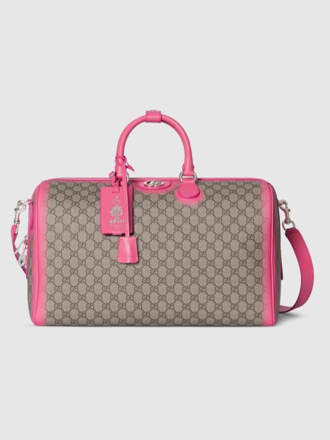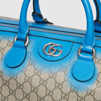 A unique airbrushed effect in distinctive colors reinterprets the emblematic GG motif with an impactful look. This duffle bag is stated in GG Monogram coated fabric and features a contrasting airbrushed effect across its contours. - Beige and dark brown GG Monogram coated fabric with airbrushed effect - Blue leather trim - Palladium-toned hardware - Natural cotton linen lining - Double G - Capacity: 28L - Inside: 1 zip pocket - Outside: detachable Liftboy ID tag, 1 lock and 1 key holder - Handle drop: 4.7" - Detachable and adjustable leather shoulder strap with 46.8" - 52.7" drop - Zip closure - 17.3"W x 11.4"H x 9.8"D - Weight: 5lbs, approximately - Made in Italy