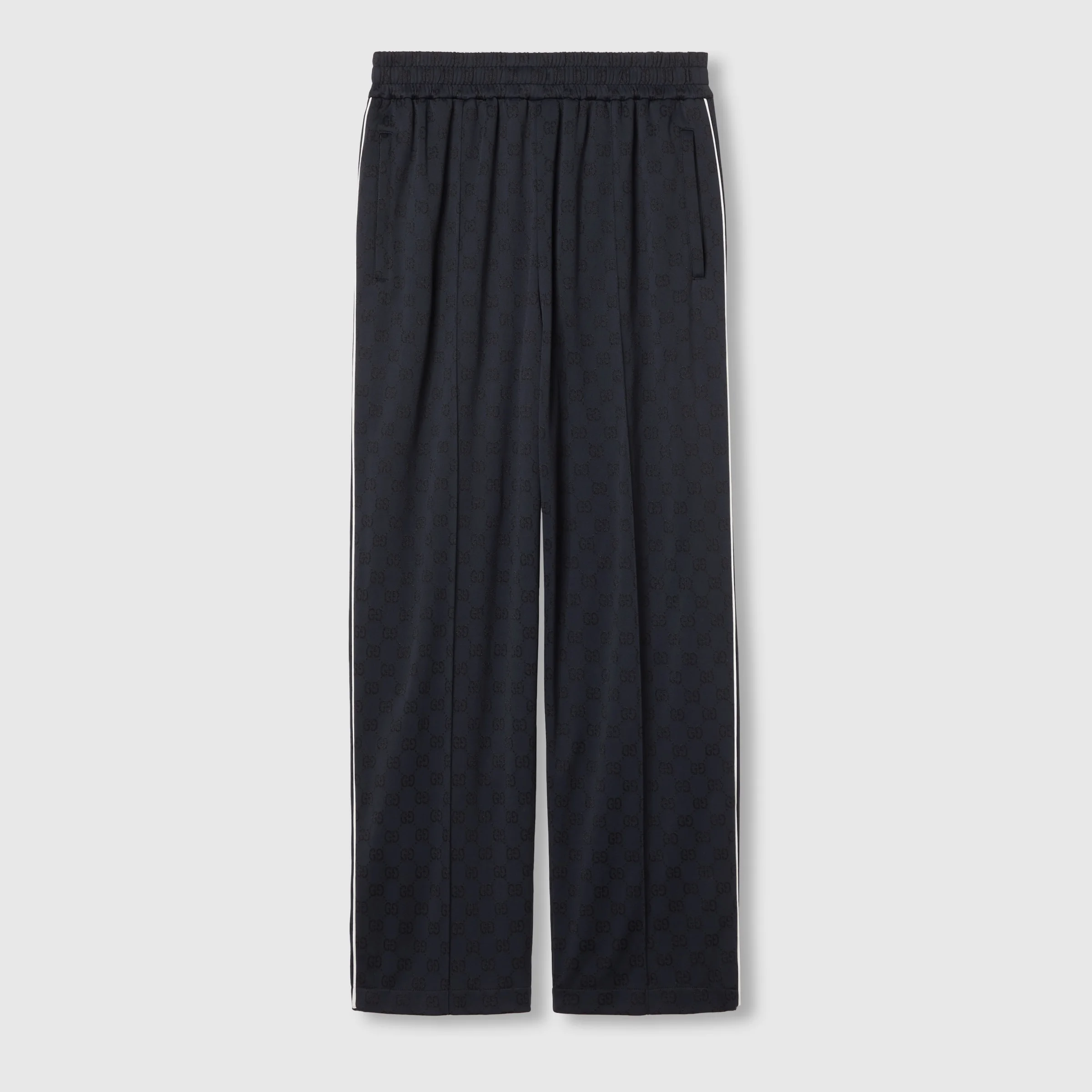 Gucci's House codes continue to evolve for the new season across jersey pieces. These wide leg pants are presented in a GG nylon and cotton technical jersey jacquard with contrasting white piping detail. - Navy GG nylon and cotton technical jersey jacquard - White piping detail - Elastic waist with drawstring - Two side pockets - Wide leg - Made in Italy - The product shown in this image is a size medium