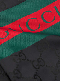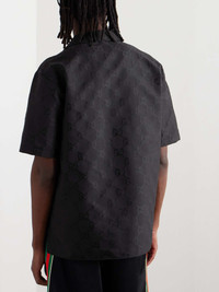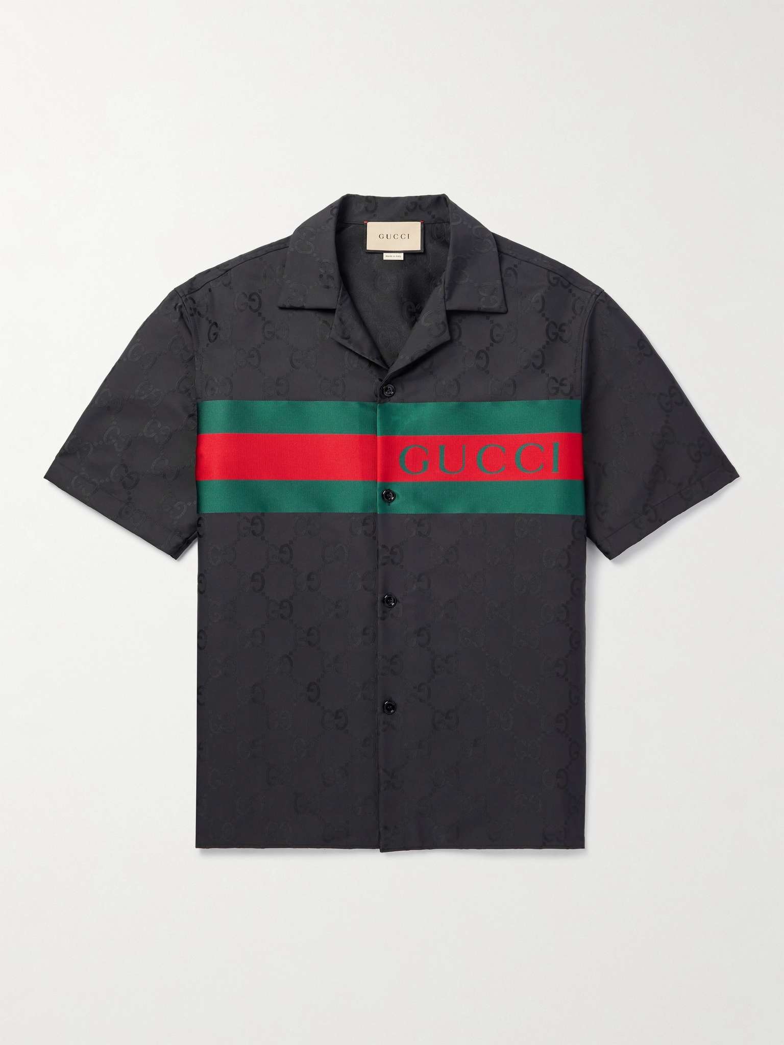 Gucci is never shy when it comes to its house codes - this camp-collar shirt is trimmed with red and green twill to resemble the iconic striped webbing across the chest. It's been made in Italy from lustrous satin that's jacquard-woven with a classic monogram. Size & Fit - Fits true to size. Take your normal size - Designed for a boxy fit - Mid-weight, non-stretchy fabric - Model is shown wearing an IT 48 - Model measures: chest 38"/ 96cm, height 6'0"/ 183cm Details & Care - Black satin, red and green twill - Button fastenings - 71% polyester, 29% polyamide