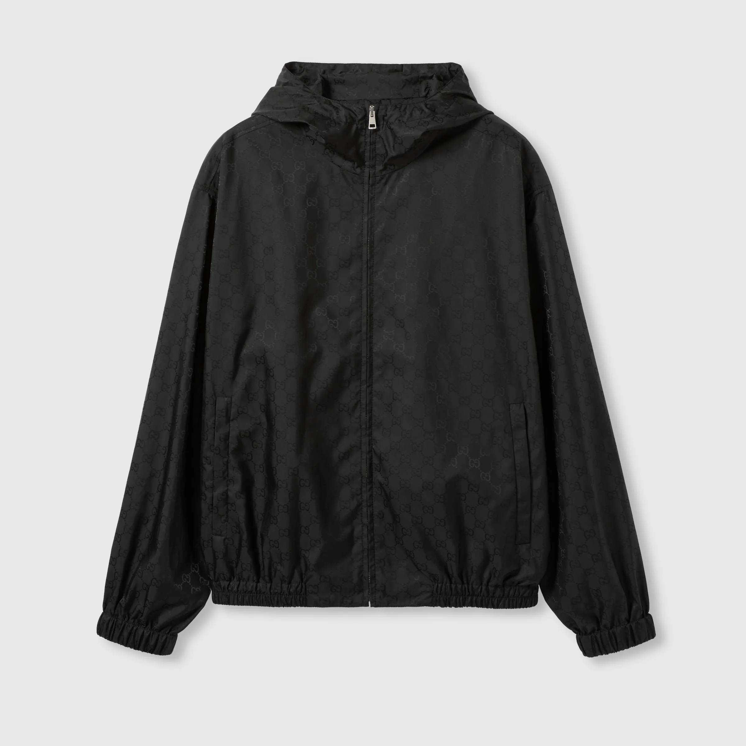 Pre-Fall 2025 pieces in muted black, grey and green tones spotlight delicate floral embroideries, embossed logos, and more craftsmanship details. This packable hooded jacket is presented in black GG nylon jacquard. - Black GG nylon jacquard - Packable - Fixed hood with internal drawstring - Dropped shoulder - Two side pockets - Elastic hem and cuffs - Zip closure - Length: 27.2"; Shoulder: 23.6"; Chest: 27.4"; Sleeves length: 36.2"; based on a size 48 IT - Made in Italy