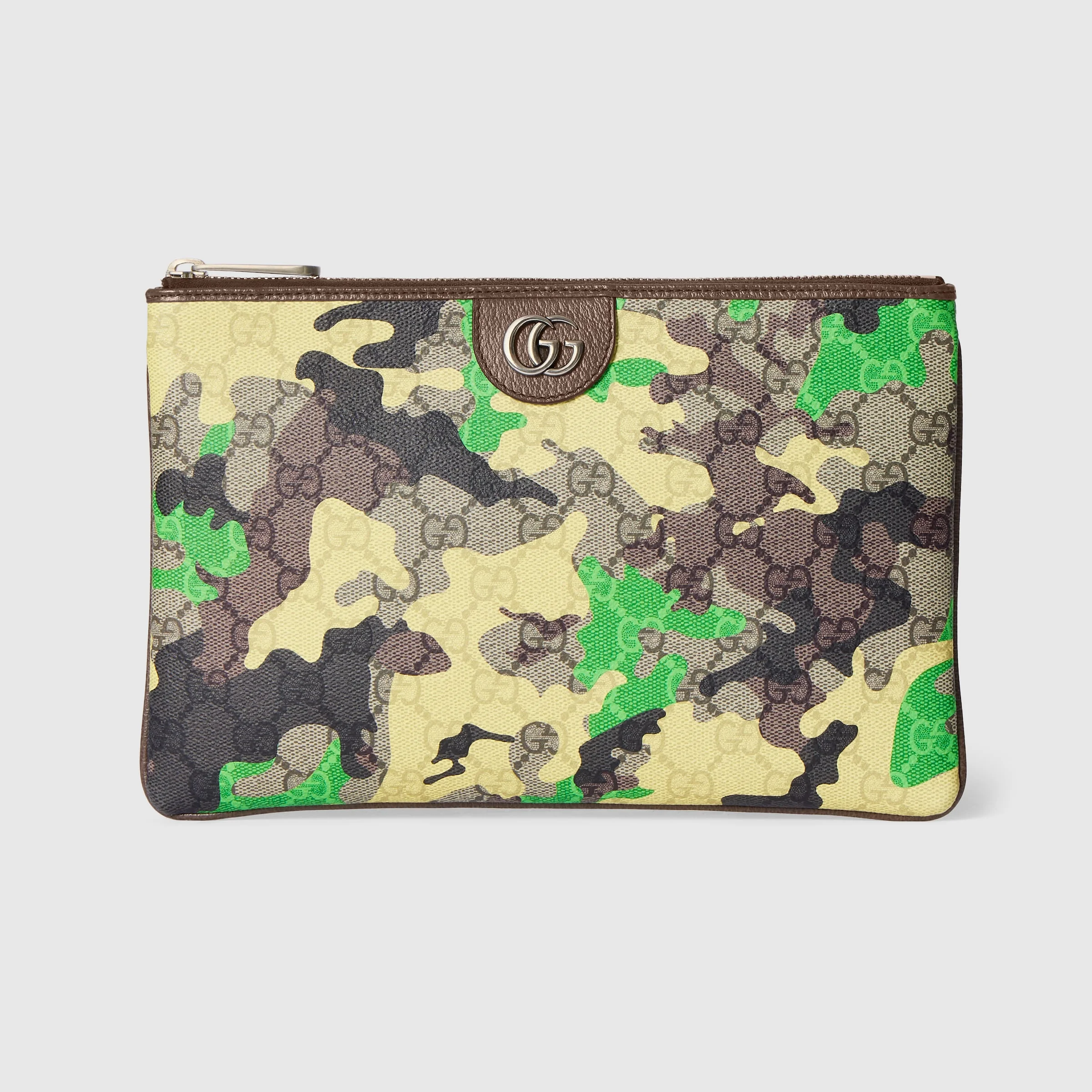 Vibrant camouflage in distinctive colors reinterprets the emblematic GG motif. Crafted from a marbled GG Monogram coated fabric, this pouch features a Double G detail. - Green and yellow camouflage marbled GG Monogram coated fabric - Brown leather trim - Palladium-toned hardware - Beige cotton linen lining - Double G - Zip closure - 10"W x 6.8"H x 0.4"D - Weight: 0.4lb, approximately