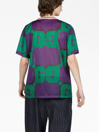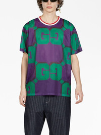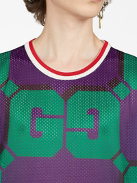GG-print short-sleeved T-shirt GG-print short-sleeved T-shirt from Gucci featuring mesh detailing, all-over logo print, purple, green, round neck, short sleeves and straight hem. Made in Italy Composition Polyester 100%, Mesh 100%