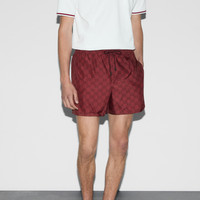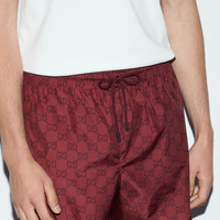 Emblematic codes of the House and refined patterns are reinterpreted in contemporary ways for the Pre-Fall collection. These straight cut shorts are presented in GG print nylon, bringing a fresh twist to the House's instantly recognizable monogram. A matching pouch offers a practical touch for days spent by the pool. - GG print bordeaux nylon - Elastic waistband with drawstring - Two side pockets - Back pocket - This item comes with a matching pouch - Please note that intimates, including swimwear, tights, socks and lingerie can only be returned in new condition. Items should be unworn, in their original packaging and with all labels attached. - Length: 15.3", based on a size 48 (IT) - Leg opening: 12.9", based on a size 48 (IT) - Made in Italy - The product shown in the image is a size 48 (IT)