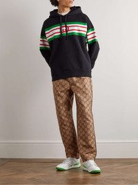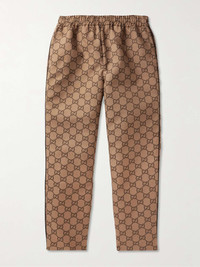 Gucci's trousers nod to the styles worn by the jet set in the '60s and '70s, regarded as the house's tailoring era. They're cut for a straight leg fit from textured crepe and woven with a signature 'GG' monogram. Wear them with a bold hoodie and sneakers. Size & Fit - Model wears a size larger to achieve a looser fit - Relaxed-straight leg, low-crotch style - Elasticated at the waist - Mid-weight, non-stretchy fabric - Model is shown wearing a IT 48 - Model measures: waist size 30, height 6'2"/ 188cm Details & Care - Brown and beige textured-crepe - 100% polyester; lining: 100% cotton - Dry clean