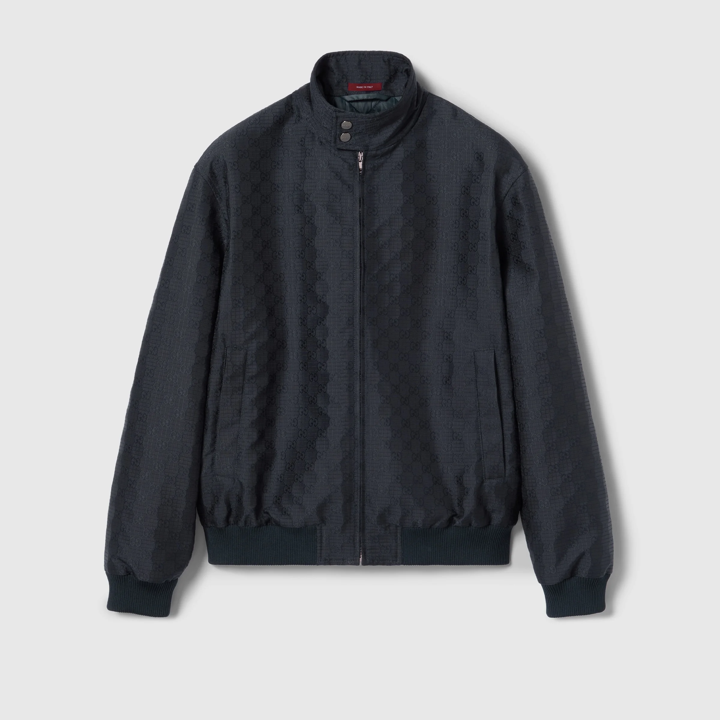 The distinctive GG is translated across different textile techniques in the collection, offering visual richness. Crafted from dark blue GG polyetser ripstop, this zip jacket features a quilted lining for comfort and structure. - Dark blue GG polyester ripstop - Quilted lining - Stand up collar with buttons - Rib trim - Side pockets - Long sleeves - Front zip closure - Length: 27.1"; based on a size 48 (IT)