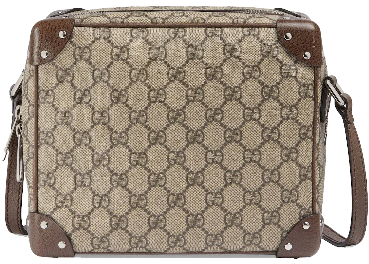 Inspired by vintage trunks and travel luggage, the GG Supreme shoulder bag has a squared shape, finished with leather corners and zip-top closure. Reminiscent of traditional suitcases, the structured design is finished with logo engraved metal feet. Pieces with versatile ways to wear and style embrace each person who is part of the House’s individual spirit. - Beige/ebony GG Supreme canvas, a material with low environmental impact, with brown leather trim - Cotton linen lining - This product contains leather made through an alternative chrome free tanning process, reducing the environmental footprint compared to traditional methods. - Interior: 1 zipper pocket - Adjustable shoulder strap with 19.7" drop - Zipper closure - 9"W x 7.5"H x 4"D - Weight: 1.3lbs - Made in Italy