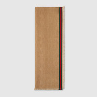 Established symbols and patterns of Gucci's heritage continue to evolve for the Pre-Fall 2024 collection. Crafted from beige GG silk cotton, this stole is enriched with a Web trim. - Beige GG silk cotton - Green and red Web trim - Fringe edges - 27.6"W x 70.9"L - Made in Italy