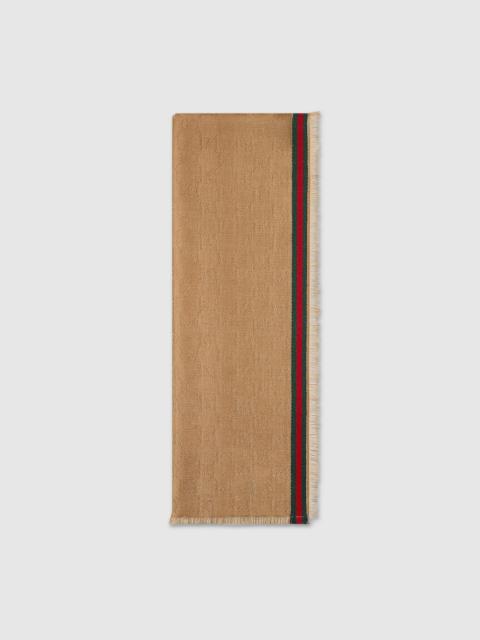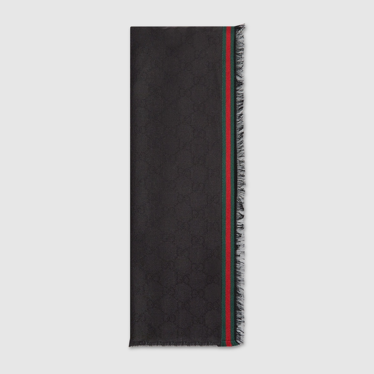 Established symbols and patterns of Gucci's heritage continue to evolve for the Pre-Fall 2024 collection. Crafted from black GG silk cotton, this stole is enriched with a Web trim. - Black GG silk cotton - Green and red Web trim - Fringe edges - 27.6"W x 70.9"L - Made in Italy
