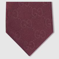 Introducing Spring Summer 2026. This style is featured in the "Direttore" look of La Famiglia. Silk and soft accessories designs continue to reinterpret emblematic codes through a creative lens in the collection. This tie is stated in GG silk cotton jacquard and reveals a Gucci crest label on the reverse. - Bordeaux GG silk cotton jacquard - Gucci crest label - 2.75"W x 58.2"L - Made in Italy - Main fabric: cotton 56%, silk 44%;lining: cotton 56%, silk 44%