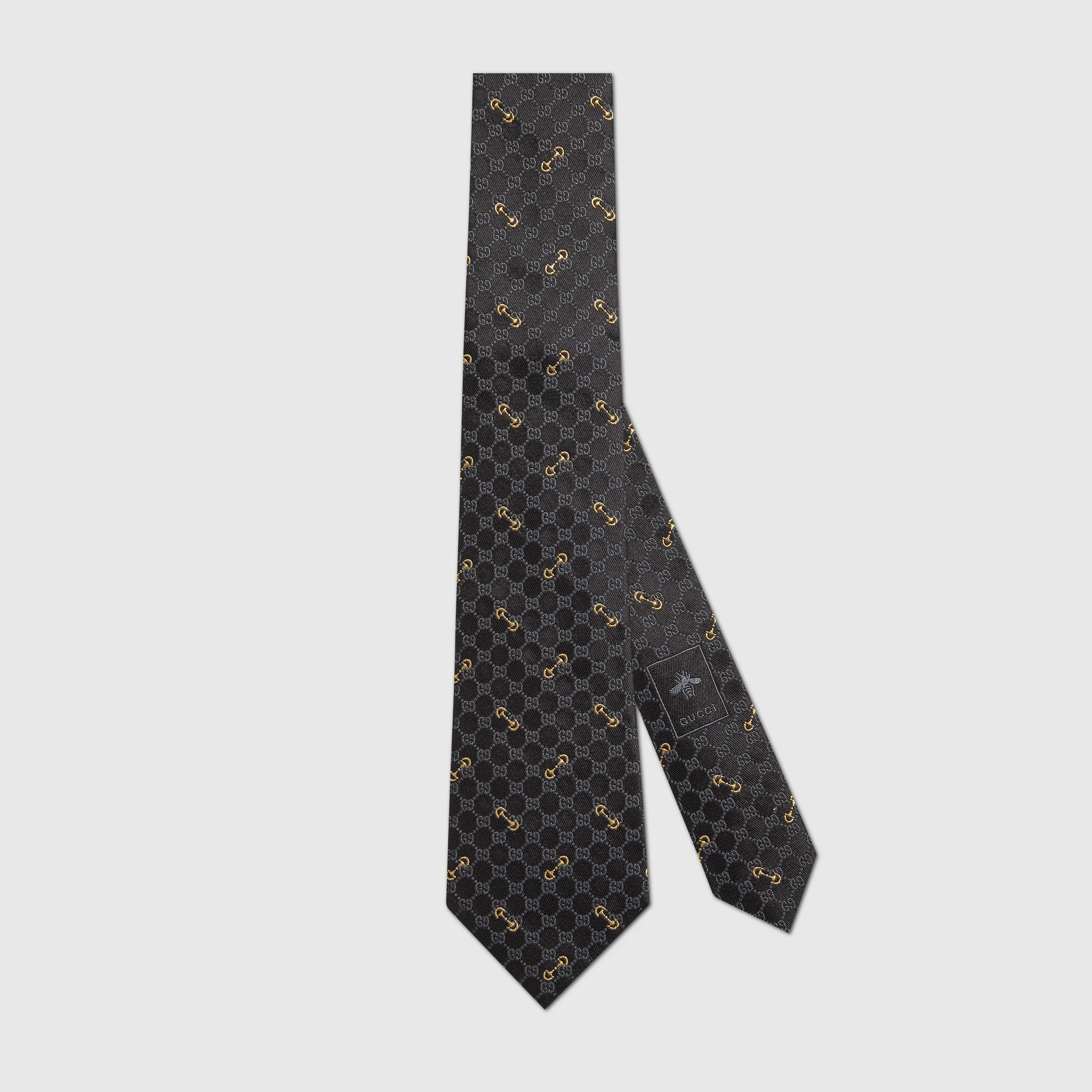 An established symbol of Gucci's heritage, the Horsebit dates back to the '50s. Inspired by the House's equestrian heritage, this silk tie is defined by a Horsebit embroidery. - Black and grey GG silk jacquard - Horsebit embroidery - 2.75”W x 58.3”L - Made in Italy