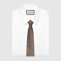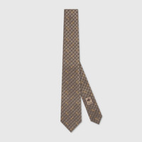 Emblematic codes of the House and refined patterns are reinterpreted in contemporary ways for the Pre-Fall collection. The GG motif appears as a jacquard detail across this brown and camel silk tie. A Horsebit embroidery enriches the designs as an extra logo detail. - Brown and camel GG silk jacquard - Horsebit embroidery - Embroidered Gucci bee label on the back - 2.75”W x 58.3”L - Made in Italy