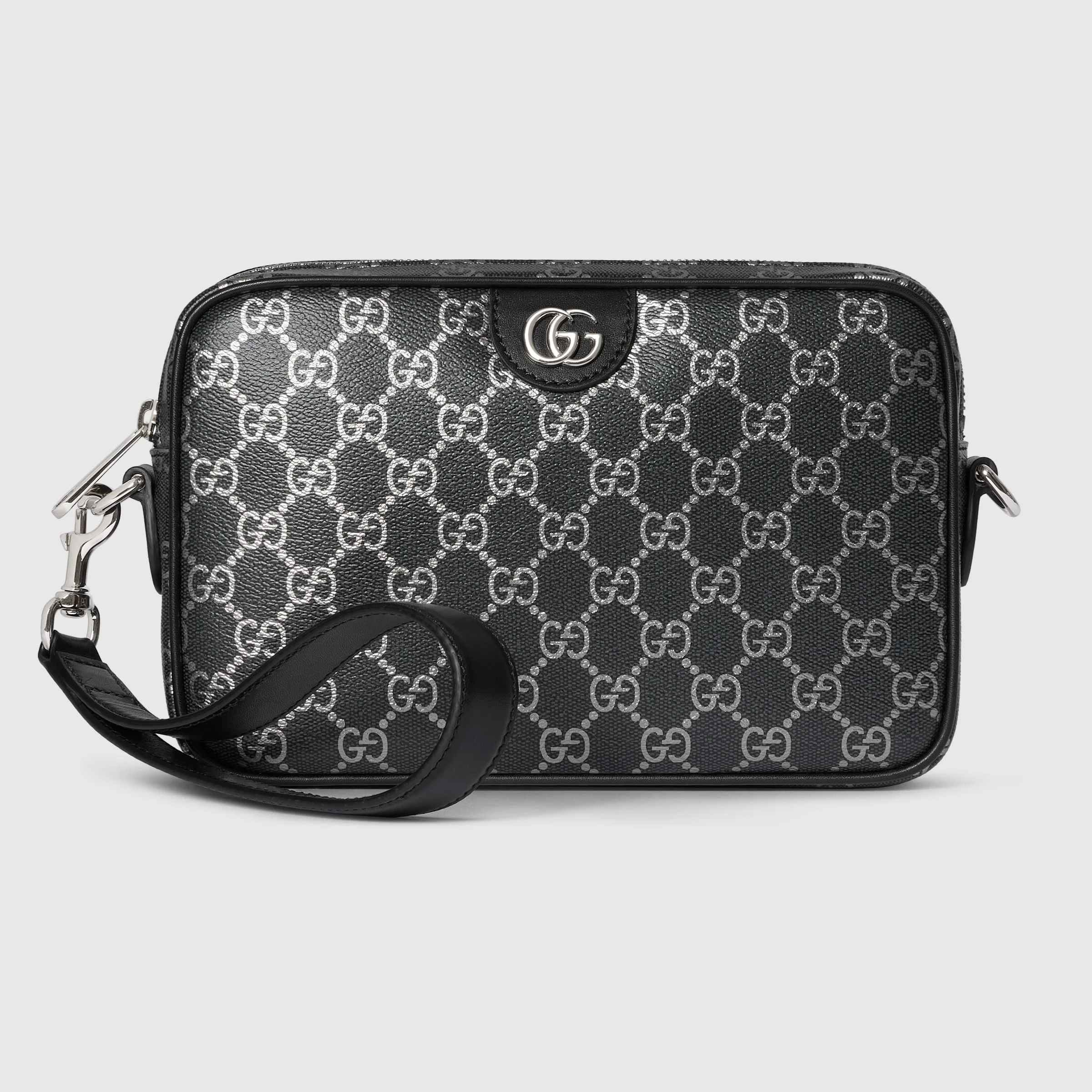The Cruise 2026 collection reinterprets the House’s history of elegance and craftsmanship, introducing metallic styles which impart new light on the signature GG motif. This small crossbody bag has been crafted from a laminated-effect GG Monogram coated fabric and features a Double G detail. - Black and silver laminated-effect GG Monogram coated fabric - Black leather trim - Palladium-toned hardware - Black cotton linen lining - Double G - Web detail - Detachable leather handle drop: 6.6" - Adjustable canvas shoulder strap with 19.7" drop; Length: 33.1"-52.7" - Zip closure - 9.4"W x 5.9"H x 1.5"D - Weight: 1.1lb, approximately - Made in Italy - Fits iPhone Plus, bi-fold wallet or card case, and Airpods