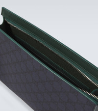 Detailed with the brand's signature motif, this pouch with strap features leather trims and a zipped top. A historic interpretation of founder Guccio Gucci's initials, the GG pattern is key to the house of Gucci. Product Details - Material: fabric, leather - Lining: fabric - Made in Italy - Color: blue - Designer color name: Blu DK Blu Blu/Green - Hardware color: silver - Closure: zipped top - Internal details: single compartment, Card slots - Detachable wrist strap - Includes: box, dust bag - Item number: P01124370 Size & Fit - Height 18cm-7" - Width 26cm-10" - Depth 5,5cm-2" - Length of wrist strap 35cm-14"