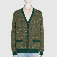 Classic knitwear is reimagined with refined details and emblematic House codes. Crafted from green and camel wool cashmere blend, this cardigan highlights the classic GG pattern as an allover jacquard, while the woven leather buttons add unexpected contrast. - Green and camel diagonal GG stripe wool cashmere - Woven leather buttons - Rib trims - Front pockets - Length: 28.5" based on a size small - 90% Wool, 10% Cashmere - Made in Italy - The product shown in this image is a size small