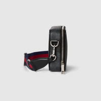 The signature GG Supreme canvas remains an evergreen of the House thanks to its soft and malleable qualities. Crafted from a coated microfiber fabric, here it appears in an all black variation to define this mini shoulder bag. A tonal leather trim completes the style, while a pop of color appears in the form of the archival Web stripe. - Black GG Supreme canvas - Black leather trim - Blue and red Web stripe - Cotton linen lining - Inside: 3 card slots - Detachable and adjustable canvas shoulder strap with 19.7" drop - 8.8"W x 5.5"H x 3"D - Made in Italy