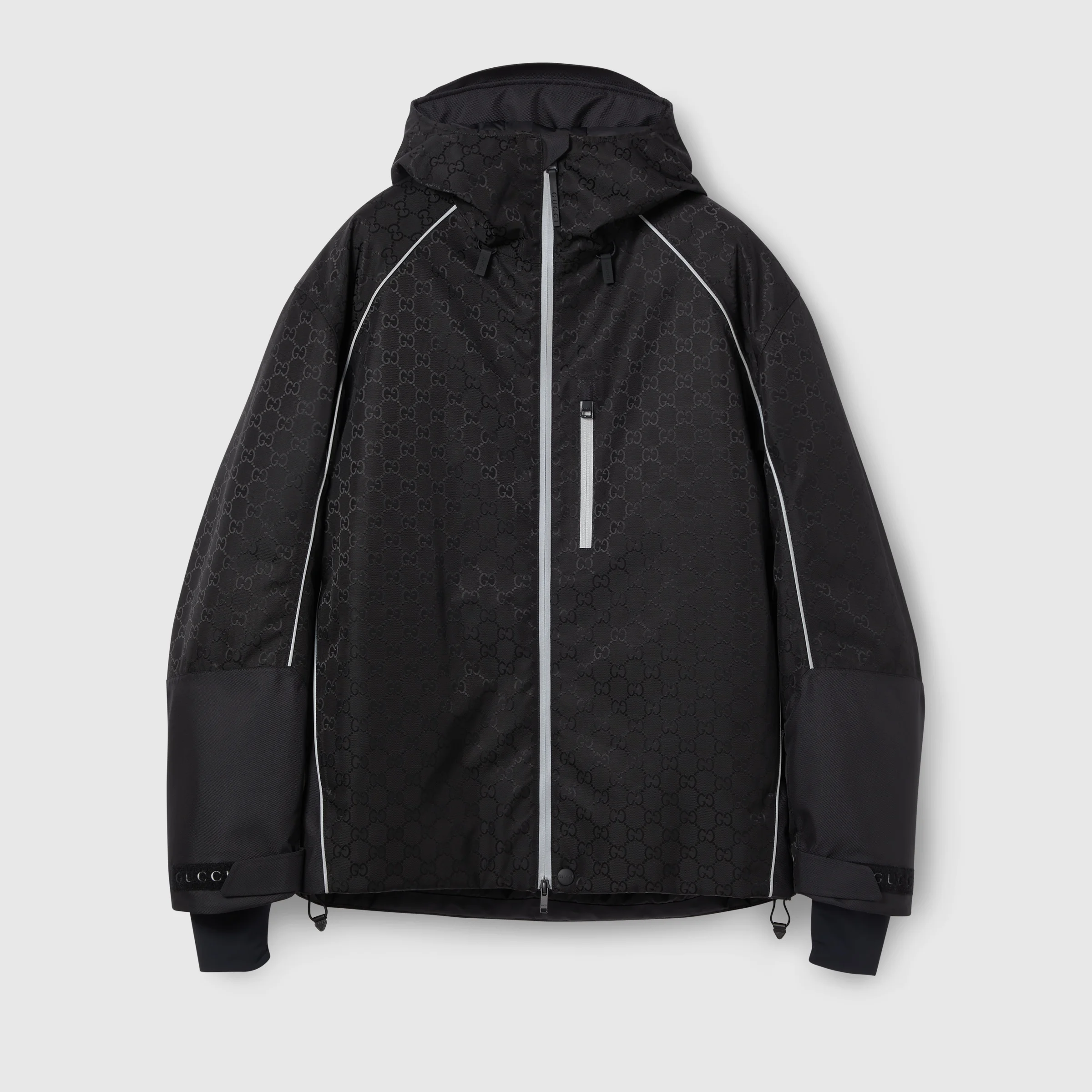 Gucci Altitude, the House's first winter sportswear collection, combines advanced performance and signature codes. This jacket appears in black GG technical fabric jacquard with membrane. - Black GG technical fabric jacquard with membrane - Contrast fabric inserts - Breathable 3-layer shell fabric construction - Windproof body gaiters with elastic band and non-slip silicone coating - Goose padding with thermo-adhesive sectors - Fixed hood - Long sleeves - Front pockets, internal ski pass pocket and phone pocket - Front zip closure - Length: 31.8", based on a size M - Details: 65% Polyester, 35% Cotton - Inner fabric: 100% Polyamide - Outer fabric: 100% Polyamide - Lining: 100% Polyamide - Lining: 100% Polyester - Filling: Duck feather, Duck down - Padding (fiber): 100% Polyester