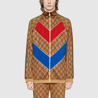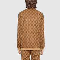 For Pre-Fall 2018 new styles are explored by incorporating original design elements and highlighting emblematic symbols like the GG. The pattern is displayed in technical jersey as a nod to the style popular in the '80s. First developed by Gucci in the 1950s, the Web stripe continues to pay homage to the House's roots and equestrian influences, here it's portrayed in its most notable combination of green and red. - Camel and brown GG technical jersey - Blue and red maxi chevron details with white piping - Green and red Web down the sleeves - Raglan sleeves - Zip pockets - Front zip closure - Oversize fit - 55% polyester and 45% cotton - Made in Italy - The model is 6’2" and is wearing size medium -