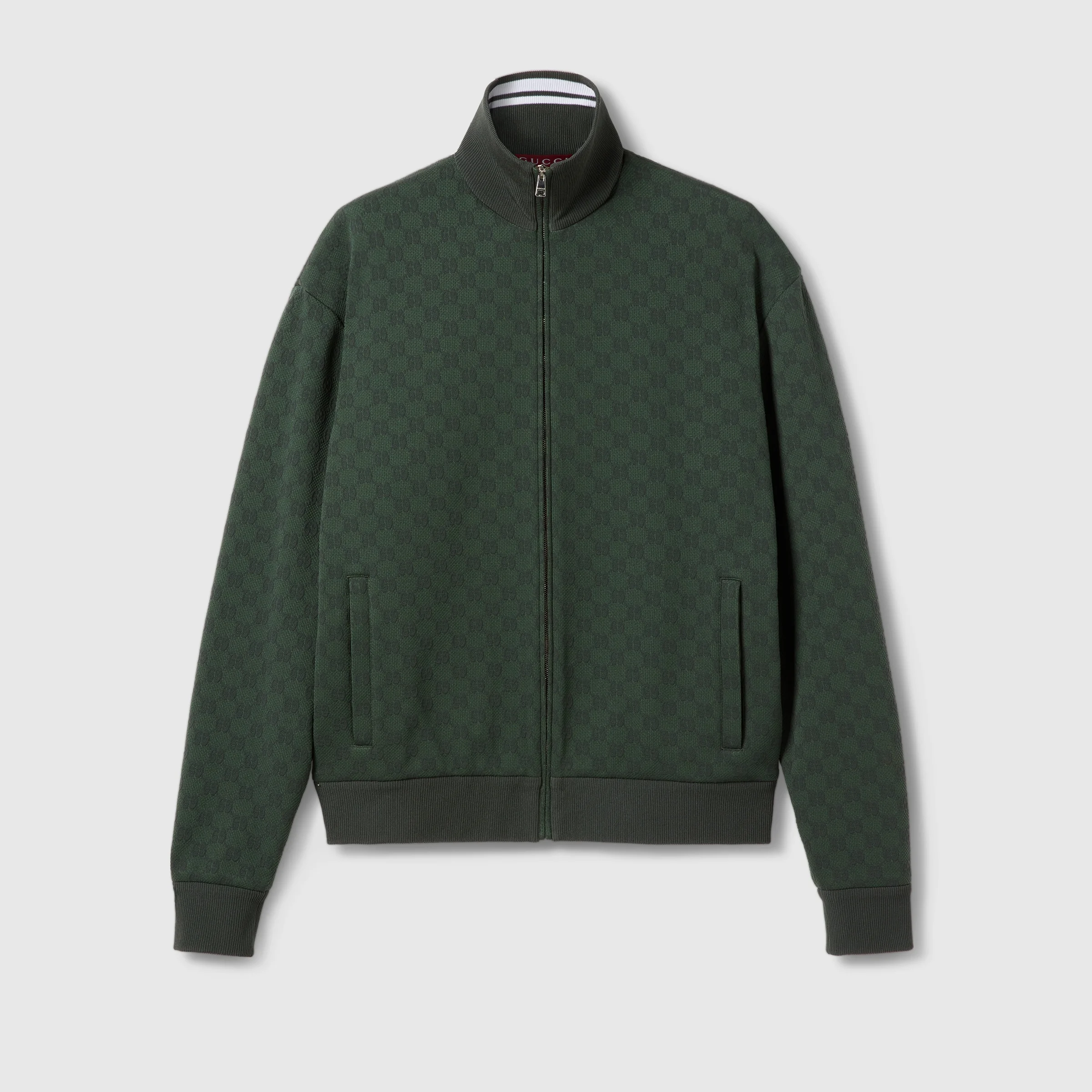 The distinctive GG is translated across different textile techniques in the collection, offering visual richness. Here, the emblematic monogram decorates this zip jacket, crafted from embossed GG technical jersey. - Dark green embossed GG technical jersey - High neck - Rib trim - Front pockets - Front zip closure - Made in Italy - Fabric: 99% Polyamide, 1% Elastane - Trimming: 87% Polyester, 9% Polyamide, 4% Elastane - Pocket lining: 100% Cotton