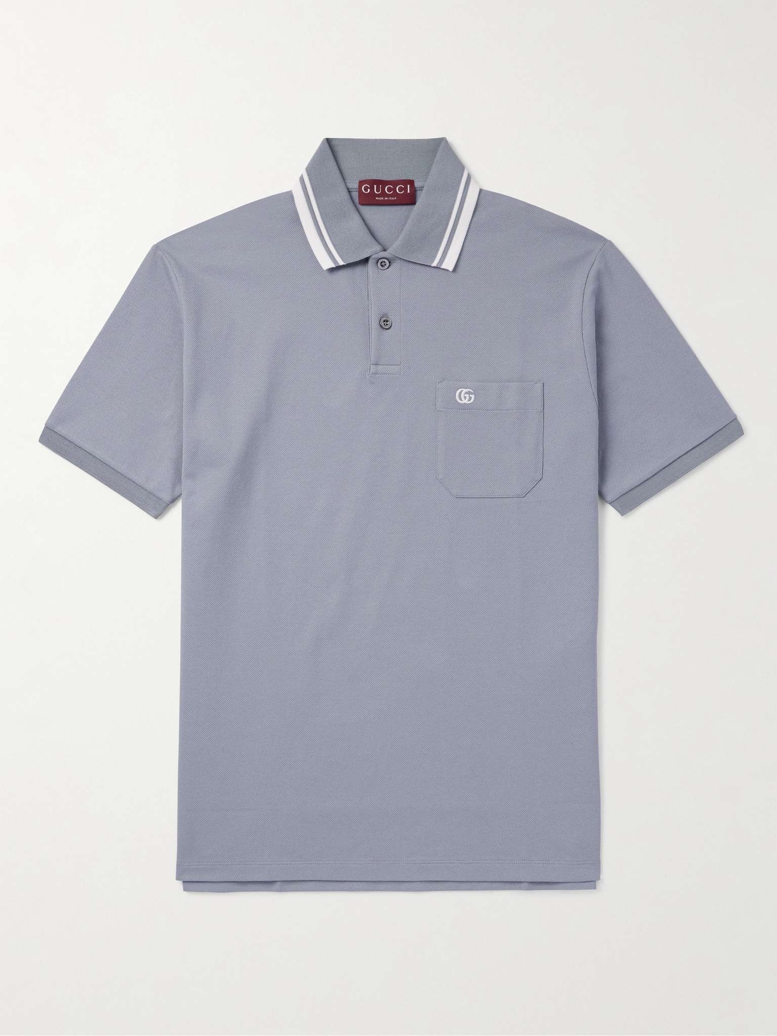 A polo shirt is a real chameleon – the right one will work across the style spectrum. Gucci's version is cut for a comfortable fit from stretch-cotton pique and embroidered with the 'GG' motif at the chest. Size & Fit - Fits true to size. Take your normal size - Designed for a regular fit - Mid-weight, slightly stretchy fabric - Model is shown wearing a M - Model measures: chest 38"/ 96cm Details & Care - Light-blue and white stretch-cotton pique - Button fastenings - 97% cotton, 3% elastane - Machine wash - Mother-of-pearl: Indonesia