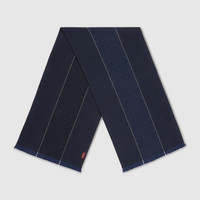 The Cruise 2026 men's soft accessories collection is a journey through legacy and modernity rooted in Gucci's archives. This soft scarf has been made from a GG wool jacquard and completed with a fringe trim. - Navy and light grey GG wool jacquard - Fringe trim - 18.5"W x 72.04"L