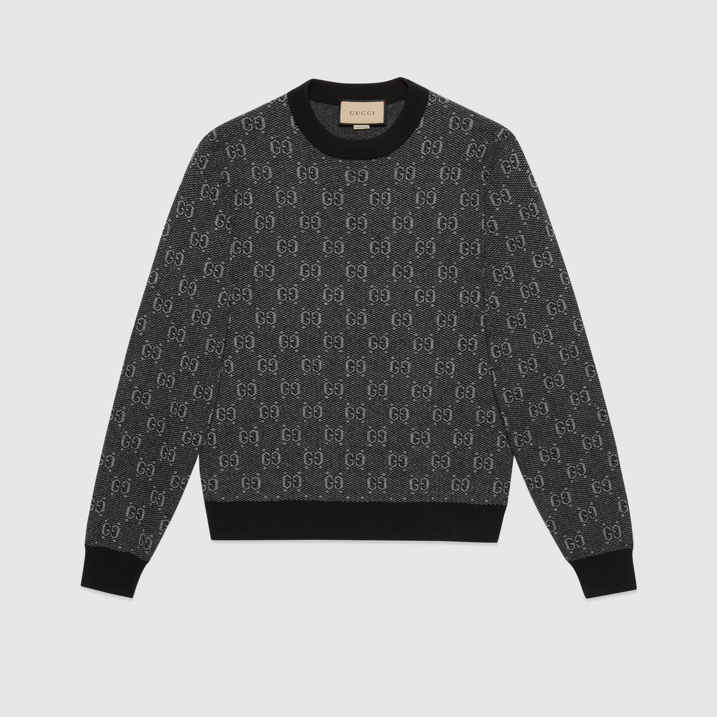 The preppy influence and historic patterns continue to characterize the Gucci narrative. First introduced in the 1970s, the monogram pattern has become synonymous with the House. Here, the GG motif animates this crewneck wool sweater. - Grey GG knit wool jacquard - Crewneck - Rib trim - Long sleeves - Length: 26.4" based on a size medium - Made in Italy - The product shown in this image is a size medium