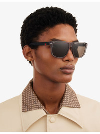 PRODUCT DETAILS Gucci sunglasses Embossed logo and web stripe temples, square-frame, charcoal lenses, silver-toned hardware, transparent rims 100% UV protection Frame width 14.5 cm Velvet case