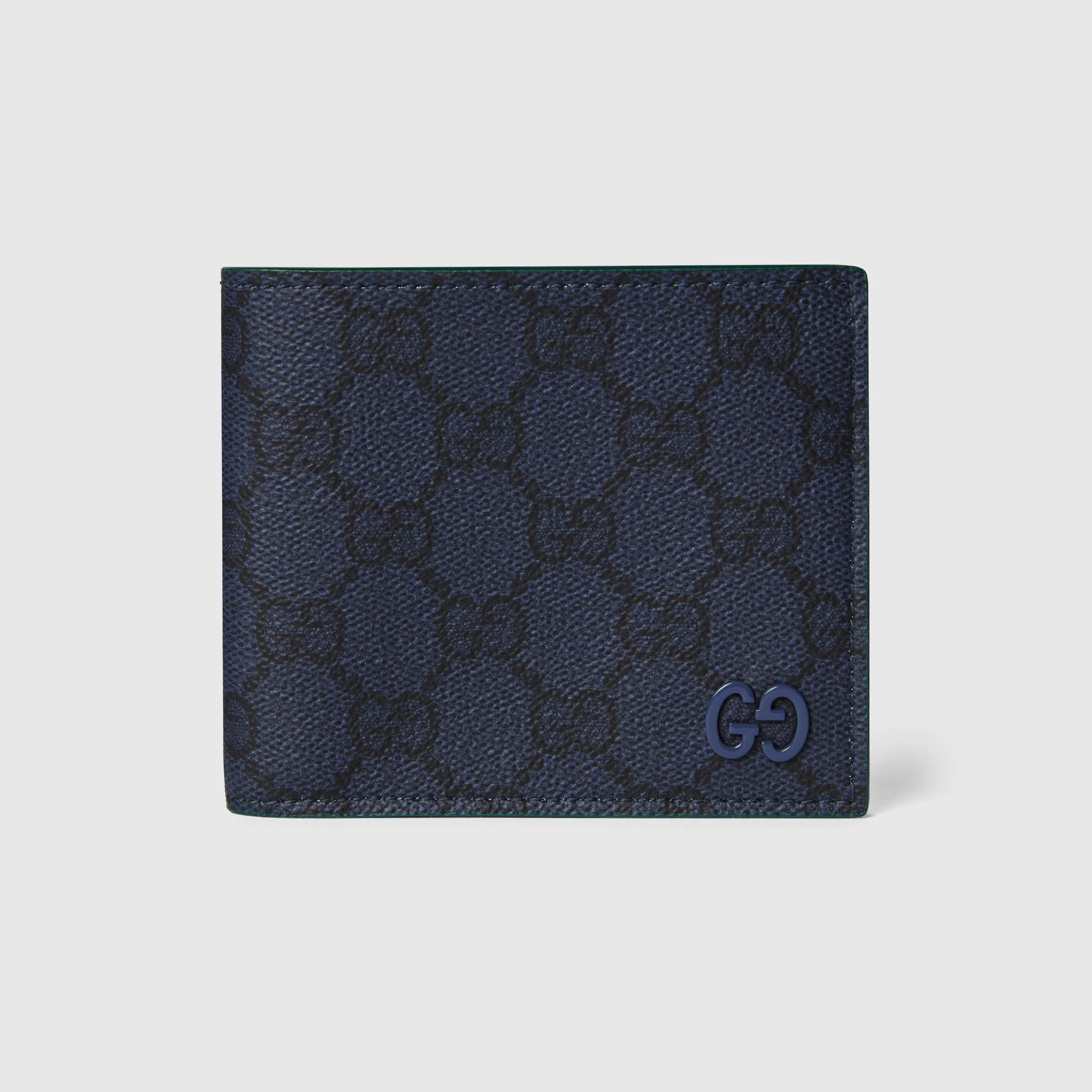 This bi-fold wallet has been crafted from soft GG Supreme and reveals an unexpected contrasting leather interior. A GG detail with a ceramic-effect completes the piece. - Dark blue soft GG Supreme - Green leather interior - Palladium hardware with blue ceramic-effect finishing - Moire lining - GG detail - Inside: 8 card slots and 2 bill compartments - Closed: 4"W x 3.5"H - Open: 8.2"W x 3.5"H - Made in Italy - Weight: 0.1lbs approximately