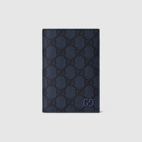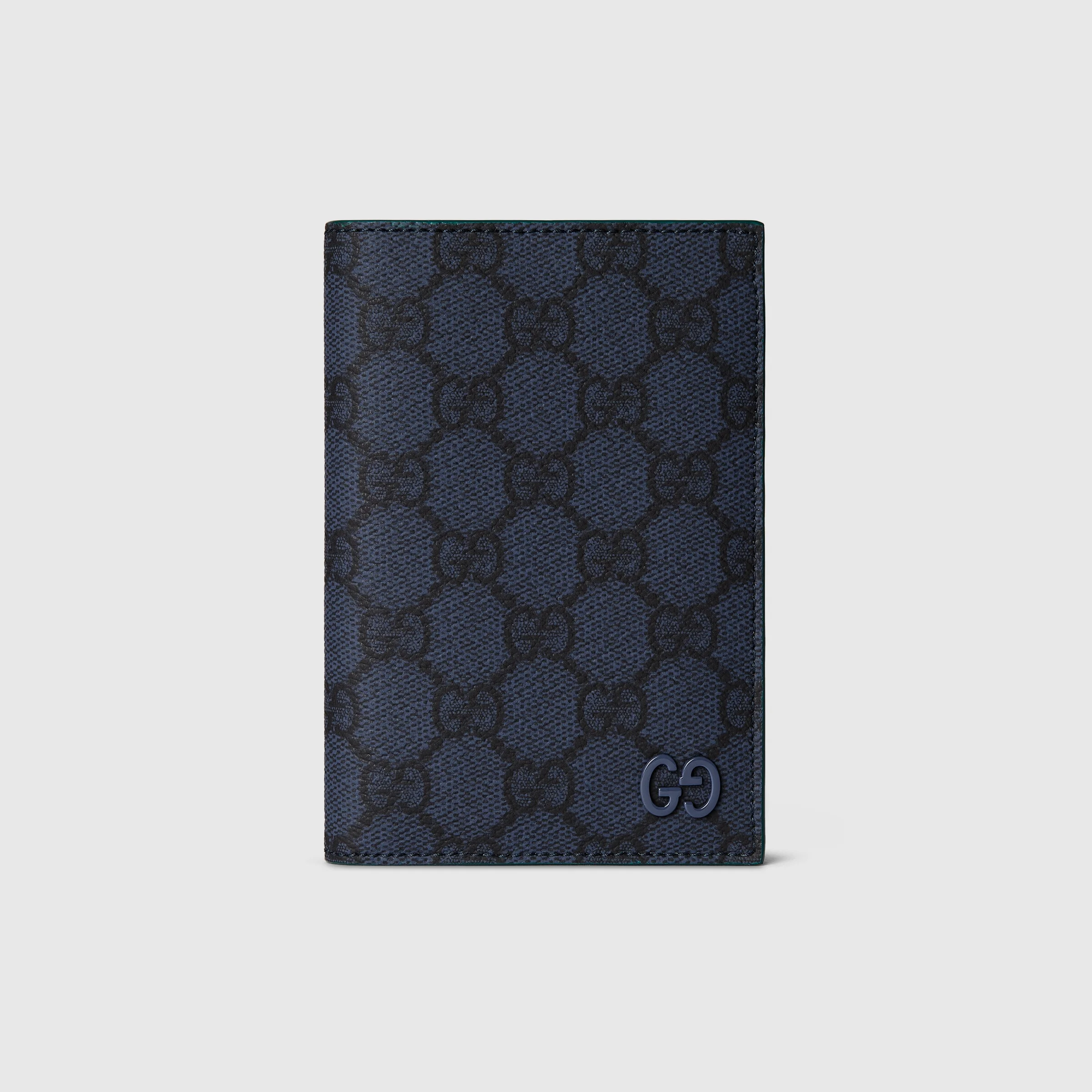 This passport case has been crafted from soft GG Supreme and reveals an unexpected contrasting leather trim. A GG detail with a ceramic-effect completes the piece. - Dark blue soft GG Supreme - Green leather trim - Palladium hardware with blue ceramic-effect finishing - Moire lining - GG detail - Inside: 4 card slots, 1 passport pocket - Closed: 3.7"W x 5.3"H; Open: 7.5"W x 5.3"H - Weight: 0.158lbs approximately - Made in Italy