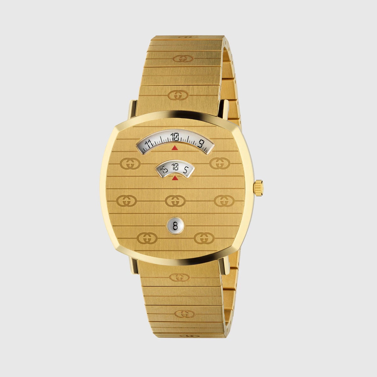 A clean, streamlined design that fits snugly around the wrist, the Grip watch takes its inspiration from the world of skateboarding, its name recalling the way the rider’s sneakers stick to the grip tape on a skateboard. The yellow gold PVD face has three windows to display the hour, minute and date, completed with a matching bracelet with engraved Interlocking Gs. - Yellow gold PVD case with Interlocking Gs, 3 windows indicating hour, minute and date, yellow gold PVD bracelet with Interlocking Gs - The warranty certificates for Gucci watches purchased after March 1st 2022 are exclusively available online. - Download your certificate at - by using the serial number engraved on the back of your watch. - Quartz movement - Water resistance: 3 ATM (100 feet/30 meters) - YA157409 - Swiss Made - Your Grip watch will arrive in a special edition floral jacquard topped packaging, available in a range of four different motifs inspired by the world of Gucci ready-to-wear. Further accentuated by a delicate gold floral pattern, the box will be individually selected for your watch and comes with a velvet pillow for product storage.