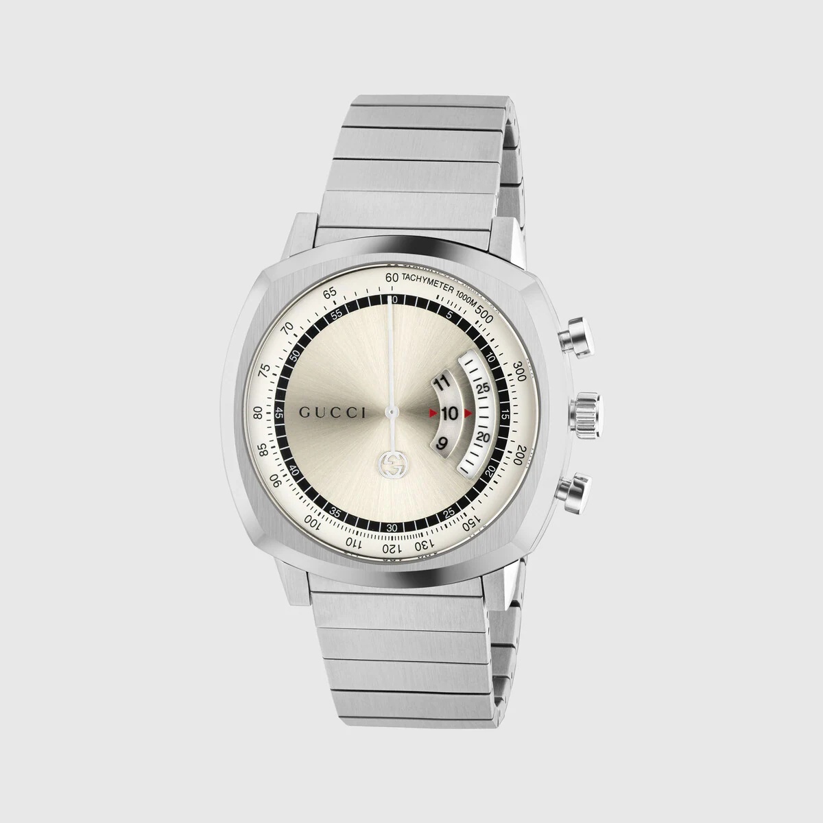 A clean, streamlined design that fits snugly around the wrist, the Grip watch takes its inspiration from the world of skateboarding, its name recalling the way the rider’s sneakers stick to the grip tape on a skateboard. Designed for a gender-neutral appeal, the stainless steel face has two windows to display the hour and minute. - Steel case, 2 windows indicating hour and minute and chronograph function, steel bracelet - The warranty certificates for Gucci watches purchased after March 1st 2022 are exclusively available online. - Download your certificate at - by using the serial number engraved on the back of your watch. - Quartz movement - Water resistance: 3 ATM (100 feet/30 meters) - YA157302 - Swiss Made