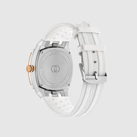The latest GUCCI 25H collection showcases a streamlined silhouette, featuring refined elements that enhance the watch's sleek design. Powered by a quartz movement, the accessory is defined by a white rubber interchangeable strap and a stainless steel case with silver dial. - 36mm stainless steel multi layered case - Pink gold-plated bezel, silver dial, Interlocking G detail, Gucci logo and date opening - Sapphire glass with antireflective coating - White rubber interchangeable strap - The warranty certificates for Gucci watches purchased after March 1st 2022 are exclusively available online. - Download your certificate at - by using the serial number engraved on the back of your watch. - Quartz movement - 5 ATM (50 meters/164 feet) - YA163439 - Wrist size from 5.5" to 7.2"