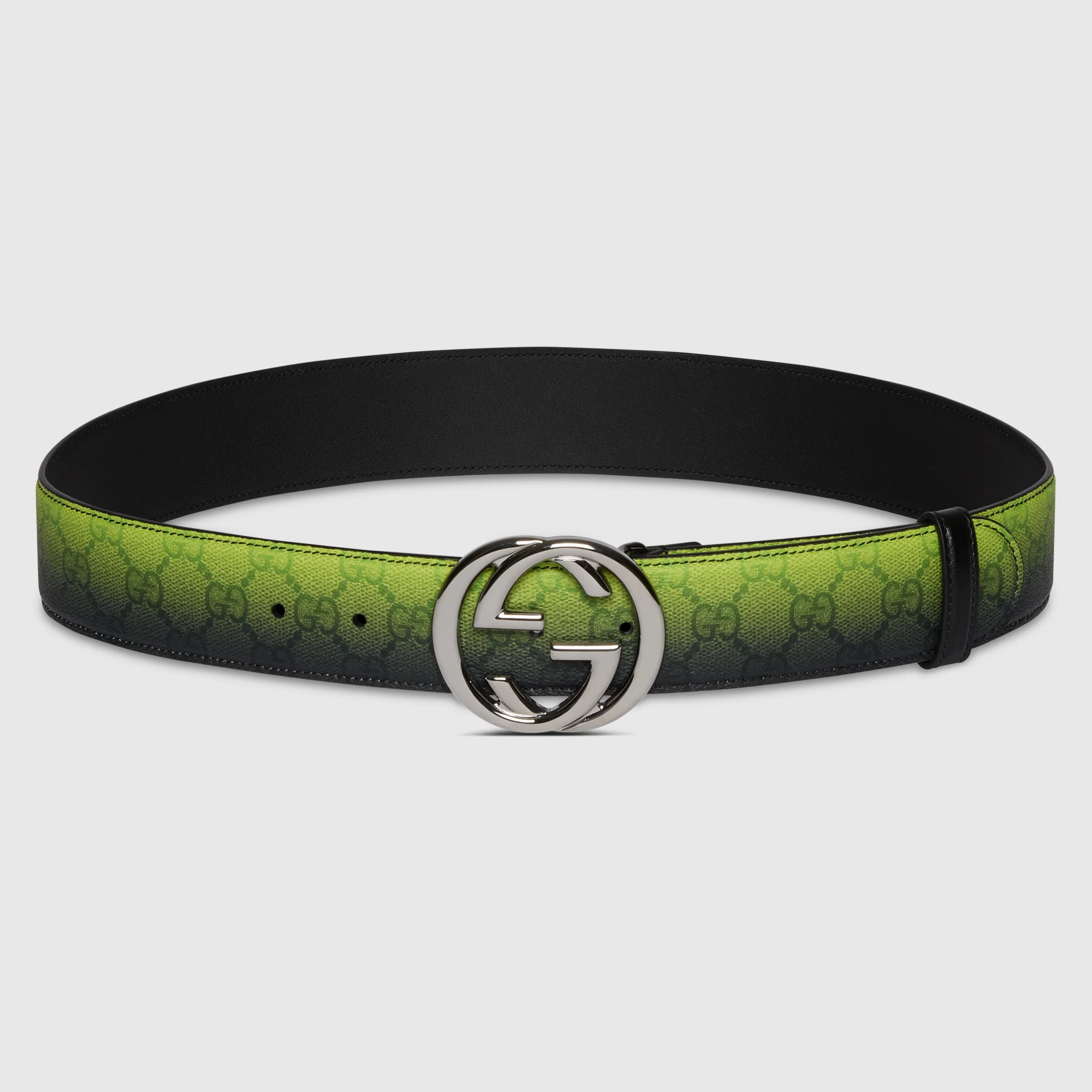 Gradient-effect print in the refreshing shade of blue sheds new light on essential functions. This belt is presented in a GG Monogram coated fabric with an allover gradient print and an Interlocking G buckle. - Gradient lime and black GG Monogram coated fabric - Ruthenium-toned hardware - Allover gradient print - Interlocking G buckle - 1.5" width - Made in Italy - Can be worn as a hip or waist belt. Sizing will differ based on where the belt is worn, please refer to the size guide to find your size.