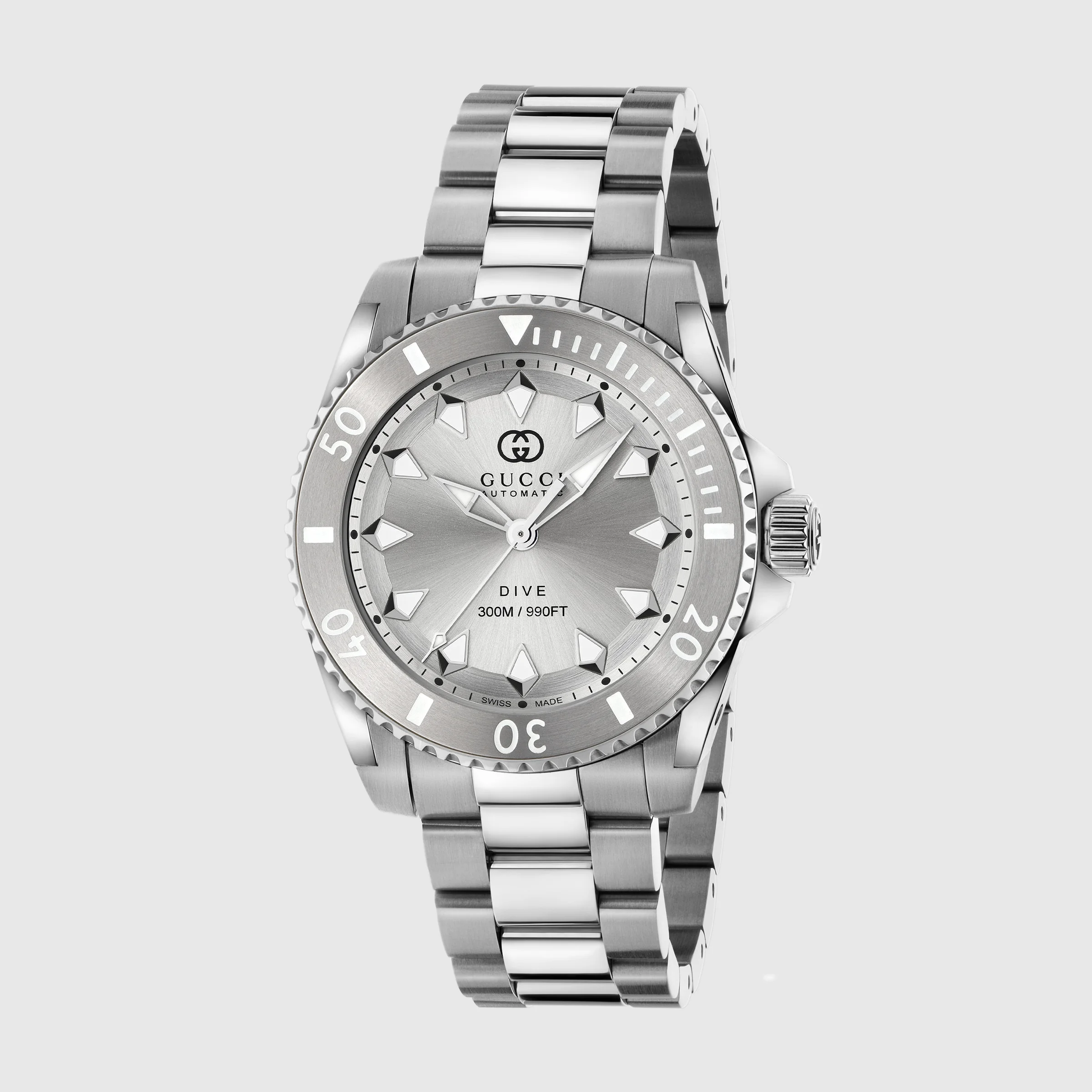 The Gucci Dive line continues to explore the House codes in contemporary ways. Powered by an automatic movement, this watch is defined by a silver dial featuring the emblematic Interlocking G logo. A stainless steel case and a stainless steel bracelet complete the style. - 40mm stainless steel case with silver bezel, silver dial with Interlocking G detail and Super-LumiNova indexes, stainless steel bracelet - Sapphire glass with antireflective coating - The warranty certificates for Gucci watches purchased after March 1st 2022 are exclusively available online. - Download your certificate at - by using the serial number engraved on the back of your watch. - 30 ATM (300meters/1000feet) - Power reserve: 38 hours - Automatic movement - Wrist size from 4.3" to 7.5" - YA136354A - Swiss Made