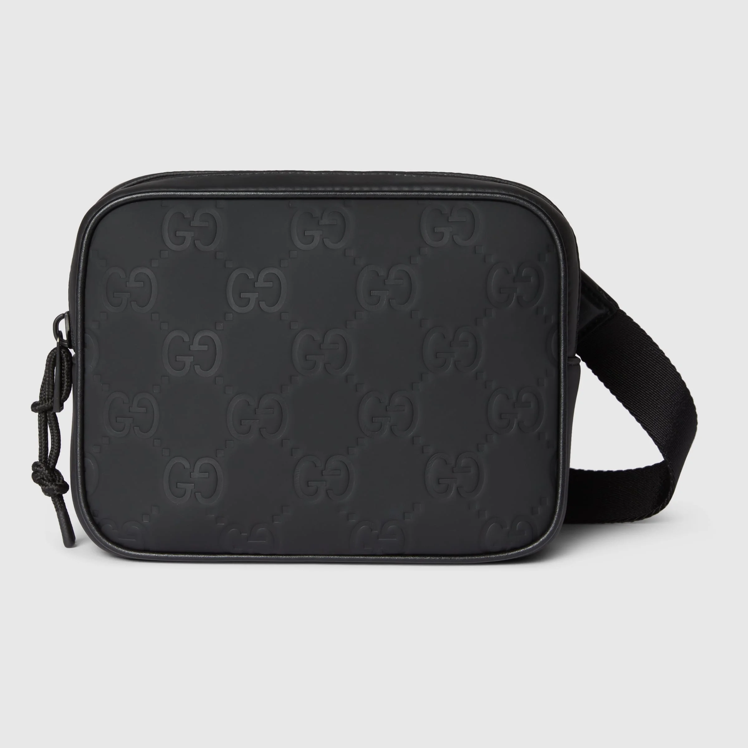 The name Gucci Edge captures the energy of streamlined silhouettes as innovative material meets lightweight adaptability, marked by the subtle GG monogram. This mini bag is stated in GG matte rubber fabric and completed with a tonal piping trim. - Black GG matte rubber fabric - Black piping trim - Black neoprene lining - Outside: 1 card slot - Adjustable canvas shoulder strap with 21.6" drop; Length: 13.4"-24.4" - Zip closure - 7"W x 5.1"H x 1.9"D - Weight: 0.7lb, approximately - Made in Italy - Fits iPhone Plus, bi-fold wallet or card case, and Airpods