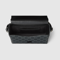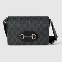The Gucci Horsebit 1955 collection introduces a mini bag with a boxy silhouette. Ideal for carrying essentials, it is embellished with black leather trim and silver-toned hardware. - Black soft GG Supreme - Black leather trim - Silver-toned hardware - Black cotton linen lining - Horsebit - Inside: 1 flat pocket - Adjustable canvas shoulder strap with 23.6" drop - Flap with magnetic snap closure - 7.2"W x 5.1"H x 2.75"D - Weight: 1lb, approximately - Fits iPhone Pro Max/Plus, bi-fold wallet or card case, and Airpods