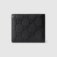 The name Gucci Imprint reflects the enduring elegance of the GG Monogram, presented as a tactile detail in everyday essentials. This bi-fold wallet is crafted in an embossed GG grainy leather with a tonal moire lining. - Black embossed GG grainy leather - Black moire lining - Inside: 8 card slots, 1 bill compartment and 2 internal flat pockets under card slots - Closed: 4.3"W x 3.5"W; Open: 8.2"W x 3.5"H - Weight: 0.2lb, approximately - Made in Italy