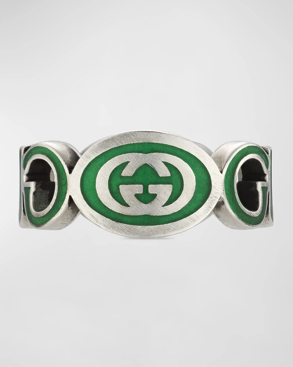 - Gucci ring - 925 sterling silver - Cutout design with Interlocking G green enamel - Made in Italy