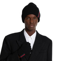 The Pre-Fall 2025 soft and silk accessories collection animates House codes through sophisticated trimmings, logo patches and subtle embroideries. This beanie hat is presented in black wool with a green and red Web detail. - Black wool - Web detail - Made in Italy