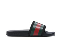 The Gucci Rubber Slides Red Green is a slip-on sandal from the Italian luxury fashion house Gucci. The upper features a faux rubber strap sporting the trademark red and green stripes from Gucci with a grainy black outline. It is attached to a thick black molded rubber footbed that is slightly raised at the heel with enough cushioning. Branding details also feature on the lateral heel section of the footbed with the ‘GUCCI’ wording embossed above the surface in a matching black tone. The rubber sole features logo patterns for traction. The Gucci Rubber Slides Red Green was released on December 22, 2021 - retailing at $210. - Style 308234 GIB10 1098 - Colorway Black - Retail Price 210 - Release Date 2021-12-22 - Featured false