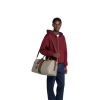 Gucci Savoy in the beige and dark brown palette offers signature silhouettes, crafted with a soft touch. This duffle bag is presented in GG Monogram coated fabric and enriched with a Double G and Web detail. - Beige and dark brown GG Monogram coated fabric - Dark brown leather trim - Gold-toned hardware - Green cotton linen lining - Double G - Web detail - Capacity: 28L - Inside: 1 zip pocket - Outside: detachable Liftboy ID tag, 1 lock and 1 key holder - Handle drop: 4.7" - Detachable and adjustable leather shoulder strap with 46.8" - 52.7" drop - Zip closure - 17.3"W x 11.4"H x 9.8"D - Weight: 5lbs, approximately - Made in Italy